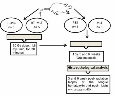 RT-PBS: animals that received radiotherapy and injected with pyrogen-free saline intraperitoneally (i.p.) 30 minutes before and 30 minutes after being subjected to radiation. RT-MLT: animals that were subjected to the irradiation protocol, which received pretreatment with 50 mg / kg of melatonin via i.p. 30 minutes before and 30 minutes after the radiotherapy session. PBS: Animals that were not subjected to radiotherapy (unconditioned) and injected with pyrogen-free saline via i.p. 30 minutes before and after the radiation simulation. MLT: Animals that were not subjected to radiotherapy (unconditioned) and injected with 50 mg / kg of melatothine via i.p. 30 minutes before and after the radiation simulation.