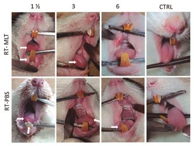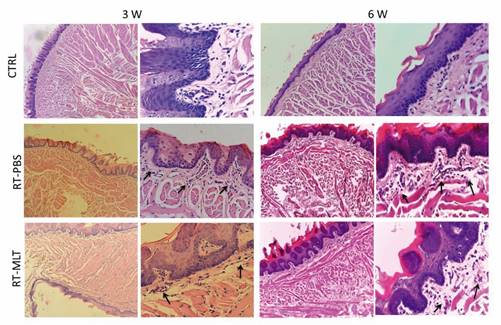 To evaluate the preventive role of melatonin pretreatment on the mucosa of irradiated animals, clinical evaluations were carried out where it was observed that all the animals that were irradiated presented changes in the tongue associated with mucositis that were reported on an ordinal scale from normal (grade zero) to scaly mucosa, with epithelial denudation and the presence of one or more ulcers, with complete exposure of the connective tissue (grade three). In the first week and a half of post radiation evaluation, 40% of the irradiated control animals (RT-PBS group) exhibited between grade 1 and 3 of mucositis while the other 60% had no tongue disorders. In the third week, the signs of mucositis decreased to only 40% in grade 1 and by the sixth week to 20%. The animals treated with melatonin (RT-MLT group) showed a similar behavior to the first week of evaluation, during which 60% of the animals presented between grade 2 and 3 of mucositis while the other 40% did not present any affection, however, by the third week, animals showed a clear decrease in the degree of mucositis where it was only observed in one animal, which corresponds to 20% of the group, being completely absent at the sixth week post radiation (Table 1), which suggests a clear trend, that the preventive administration of melatonin could facilitate the recovery of mucosal tissue after radiation. The non-irradiated groups (PBS and MLT) did not present mucositis on any of the evaluation days (Figure 2).