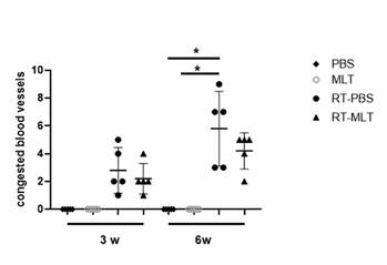 The number of congestive vessels was analyzed from tongue biopsies and it was possible to show that both irradiated groups presented abnormalities, observing a greater number of congested vessels in the RT-PBS group (2.8 ± 1.6) with a significant increase at 6 weeks (5.8 ± 2.6) with respect to PBS and MLT controls, p = 0.0265 for both cases. Similarly, RT-MLT group presented a lower number of congested blood vessels (2.2 ± 1.1 for the third week and 4.2 ± 1.3 for the sixth week) compared to the RT-PBS group, although this decrease was not significant p> 0.999. In the same way, the control groups did not show affections at the blood vessel level (Figure 4). These data suggest that radiation induce damage on the tongue blood vessel and the melatonin tend to prevent this alteration.