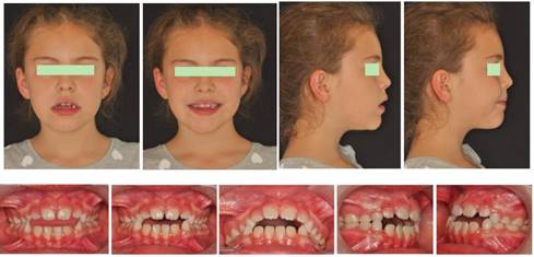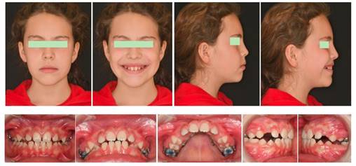Se inició con el tratamiento de expansión palatina rápida junto con la reeducación lingual y respiratoria en forma simultánea y una vez retirado el disyuntor se continuó con la terapia fonoaudiológica y se inició el manejo kinésico. Debido a que la paciente aún se encuentra en crecimiento el caso aún está en progreso, en el área de ortodoncia se debe seguir realizando controles de evolución dentaria, mantención de anclaje y control vertical. En el área fonoaudiológica precisa corregir puntos articulatorios que aún presentan alteración y mejorar deglución. También, en el área kinesiológica falta mejorar estabilidad cráneo-cervical. Sin embargo, cabe destacar que durante todo este proceso se ha mantenido una estrecha relación entre los profesionales tratantes para ir unificando criterios y evaluando resultados. Es así, como se ha visto una gran mejoría de su condición inicial, observándose un cierre labial no forzado en reposo, mentón centrado, así como un mejor resalte y escalón y una clase I molar bilateral (neutroclusión) (Figura 4).