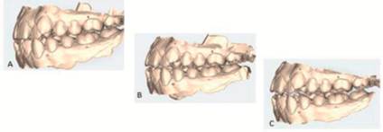Para aumentar la dimensión vertical se confeccionaron bloques aleatoriamente de 0.5mm y 1mm diseñadas digitalmente en el programa Fusion360 (Autodesk) e impresas en filamento de resina (ST-PLA, CCTREE 3D) en una impresora 3D, los cuales utilizaban la superficie completa del contacto prematuro de la pieza dentaria mandibular. Previo al escaneo de modelos, se realizaron 2 puntos de referencias en el maxilar superior y 2 puntos de referencias en el maxilar inferior. Para ello se utilizó una fresa redonda de calibre 0.8mm. La referencia anterior se ubicó a nivel del margen gingival del canino superior, siguiendo su eje mayor. En la arcada inferior se ubicó la referencia en la papila interdentaria entre el canino y el premolar, lugar donde debiese ocluir el canino superior en neutroclusión (Clase I canina). La referencia posterior se ubicó a nivel del margen gingival de la cúspide mesio vestibular del primer molar superior y en el margen gingival a nivel del surco mesiovestibular del 1er molar inferior (Figura 1). En Pacientes clase III dentarias muy marcadas, para simplificar la forma de medición se utilizaron las mismas referencias en el maxilar superior pero para determinar las referencias inferiores se proyectó una línea vertical desde el punto superior a nivel gingival de los dientes inferiores. Todos los modelos articulados fueron escaneados en el scanner intraoral Itero Element 2 (Technology 2019) y posteriormente exportados en oclusión en formato STL. Por cada modelo se obtuvieron tres archivos STL: 1.- Modelos escaneados sin aumento de dimensión vertical (Secuencia 1). 2.- Modelos escaneados con un aumento de la dimensión vertical 0.5mm del contacto prematuro (Secuencia 2). 3.- Modelos escaneados con un aumento de la dimensión vertical de 1mm del contacto prematuro (secuencia 3). (Figura 1)