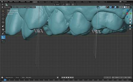 Se utilizó la aplicación MeshLab (14 para realizar un sistema de alineación avanzado conocido como “Iterative closest point” (ICP) (15. La posterior edición, consistió en exportar las geometrías y llevarlas al software Blender 2.9 (Blender 2020) para separar las piezas (maxilar superior y mandíbula), fijar el maxilar y obtener las distintas posiciones mandibulares (según los aumentos DV) con el objetivo de medir diversos puntos de interés. Se determinó la distancia vertical existente entre los puntos de referencia a nivel anterior y posterior en las tres secuencias. Una vez obtenido las longitudes verticales de las tres secuencias (Figura 2), se determinó la distancia sagital (anteroposterior) para cada par de puntos anteriores y posteriores generada a nivel mandibular (referencias mandibulares) entre la Secuencia 1 - Secuencia 2 y entre Secuencia 1 - Secuencia 3. Para aquello, una vez registrada la longitud vertical de la Secuencia 1, se proyectó dicha línea vertical hasta lograr la longitud de la secuencia 3. Luego se trazó una perpendicular entre dicha línea y la referencia inferior de la Secuencia 2 y Secuencia 3.