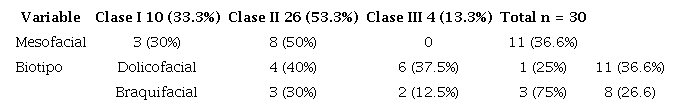 Se analizó una muestra total de 30 casos, siendo 11 de Biotipo Mesofacial, 11 Dolicofacial y 8 Braquifacial. La clase esqueletal predominante fue la clase II esqueletal (56%) con más de la mitad de la muestra (Tabla 1).
