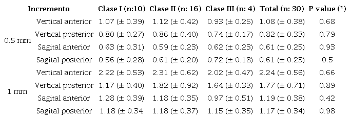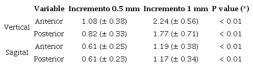 Los resultados obtenidos están descritos en la tabla 2. Se encontró diferencia estadísticamente significativa (p < 0.01) en los cambios producidos tanto a nivel vertical como sagital, al comparar los incrementos de 0.5mm y 1mm del contacto prematuro.