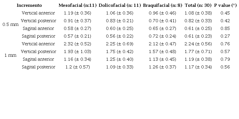 Al incrementar el contacto prematuro en 0.5mm, el mayor cambio vertical obtenido fue en el biotipo Mesofacial. No se encontró diferencia estadísticamente significativa al comparar el aumento vertical anterior (p: 0.45) y posterior (p: 0.42) entre los tres biotipos faciales. A nivel sagital, se observó una mayor variación sagital anterior (0.65mm) y posterior (0.72mm) en el biotipo Braquifacial, sin significancia estadística. No existe diferencia estadísticamente significativa tanto a nivel anterior como posterior según biotipo facial. Al incrementar el contacto prematuro en 1mm, el mayor cambio vertical obtenido fue en el biotipo Mesofacial. No se observó diferencia estadísticamente significativa en ambas mediciones entre los 3 biotipos faciales. En el sentido sagital a nivel anterior el mayor cambio se produjo en el biotipo Dolicofacial, observándose un cambio anteroposterior de 1.25mm cuando se incrementa el contacto prematuro de 1mm. No se encontró diferencia estadísticamente significativa tanto en el aumento sagital anterior y posterior entre los tres biotipos faciales. Los resultados obtenidos se describen en la Tabla 3.