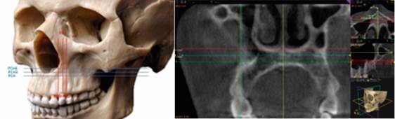 Para el procesamiento de la imagen, cada CBCT se procesó con el software CS 3D Imaging Software (Carestream Dental, Rochester, NY, USA). Se posicionaron de acuerdo a los planos sagital, coronal y transversal. En la vista frontal, la línea media del paciente se alineó de acuerdo con la línea de orientación del software. En la vista lateral, los puntos de referencia fueron: punto orbitario y plano horizontal perpendicular a medio sagital, una vez ubicados estos puntos, se trazó el plano horizontal basal.