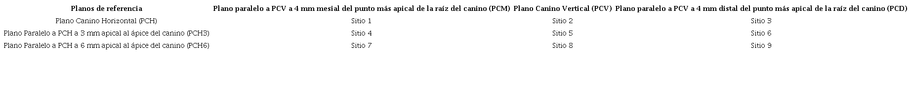 Se utilizó la hemiarcada derecha de cada paciente para realizar las mediciones y se definieron 3 planos horizontales y 3 planos verticales dando como resultado 9 puntos de intersección entre ellos descritos en la tabla 1.