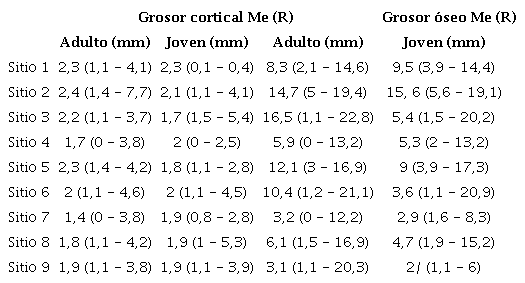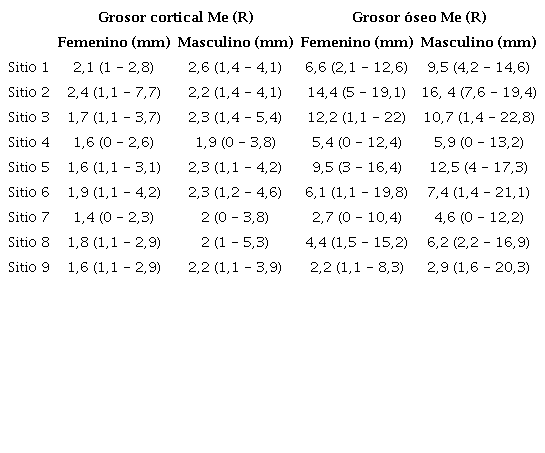 Para cada variable se calculó la mediana y rango de los valores obtenidos para el grosor cortical y grosor óseo en cada uno de los 9 sitios.
