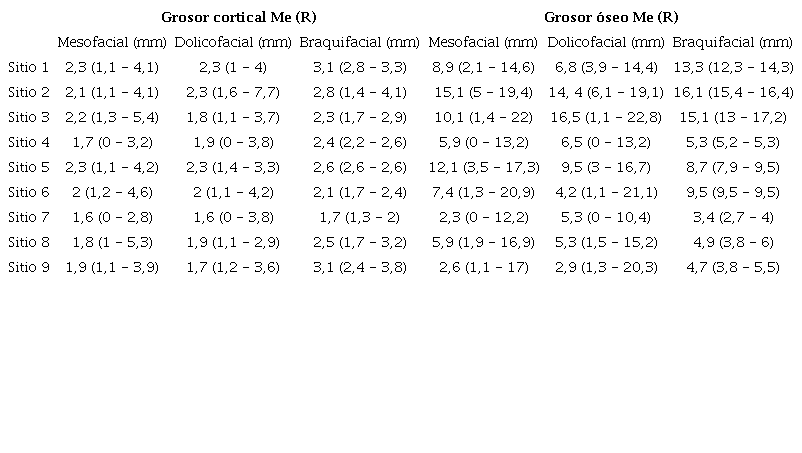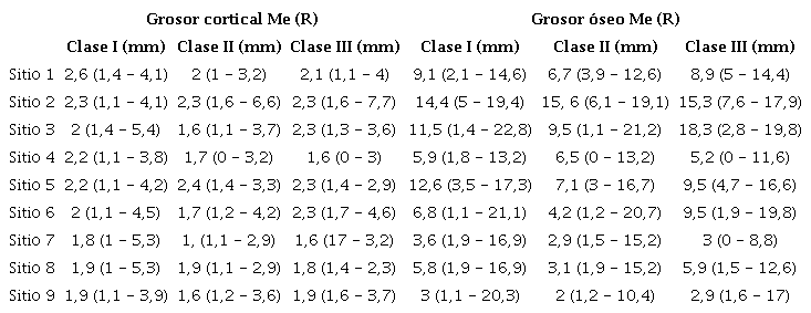 Los grosores corticales obtenidos en general van de los 0 a los 7.7 mm y los grosores óseos van de los 0 a los 22.8 mm. Los resultados obtenidos mostraron una distribución homogénea de los grosores tanto de la cortical como del grosor óseo total, lo que se corresponde con la información encontrada en la literatura donde no se observaron diferencias estadísticamente significativas en estos grosores comparados según biotipo y clase esqueletal10,11.