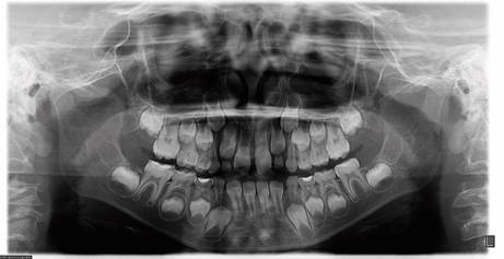 The 10-year-old male patient was accompanied by his mother to the Specialized Pediatric Dentistry Clinic. The guardian signed the consent form and the patient agreed to the treatment. The main complaint was great sensitivity while eating and brushing his teeth. The guardian denied that the child was under current medical treatment, but reported a history of respiratory disease. The initial panoramic radiograph (Figure 1) was analyzed, and it was noted that at the time of the examination, the child was in the first transitional period of mixed dentition, with erupted first molars and permanent central incisors in the upper and lower dental arches.