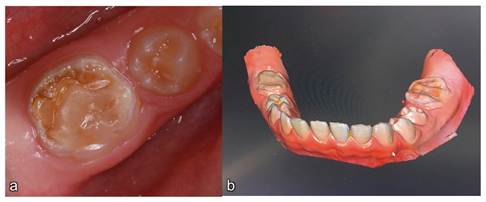 Due to the large loss of tooth structure in the lower left permanent first molar (Figure 3a), which made it impossible to efficiently seal the cavity with glass ionomer cement, we decided to perform a rehabilitative treatment by scanning with digital flow (Scanner 3 Shape® device) (Figure 3b) and subsequently construct a crown in polymethylmethacrylate (PMMA) to achieve greater resistance and retention of the restorative material due to the functional requirements of occlusion.