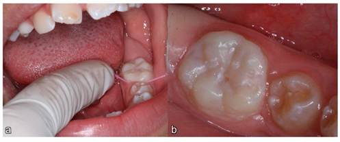 Dental treatment began with prophylaxis using pumice, water, and application of 5% fluoride varnish (Duraphat®) in an attempt to desensitize, but without success. At the next appointment, the decision was made to seal the cavities in the first permanent mandibular molars with encapsulated glass ionomer cement (Riva Light Cure®). Due to significant coronal destruction and masticatory force, the restorative material fractured and was lost.