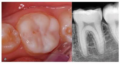 At the 12-month follow-up, there was minimal wear of the polymethylmethacrylate (PMMA) crown and good hygiene (Figure 6a). The patient reported decreased pain with chewing and cold liquids and no pain with hygiene. The periapical control radiograph showed intact enamel structure, complete root development, normal periodontal ligament, and normal-appearing bone structure (Figure 6b). At the 24-month evaluation, a slight “wear-through” stain was observed in the mesial portion of the central groove (Figure 7a). However, this did not affect the patient’s comfort or chewing function. It’s important to note that polymethylmethacrylate (PMMA) is a provisional material, and although satisfactory clinical and radiographic results were achieved over the 24 months (Figure 7a and Figure 7b), the restoration will be replaced with a definitive material after the development of permanent occlusion. For the lower right first permanent molar, the child’s caregivers opted for a definitive restoration with digital flow in Emax porcelain.
