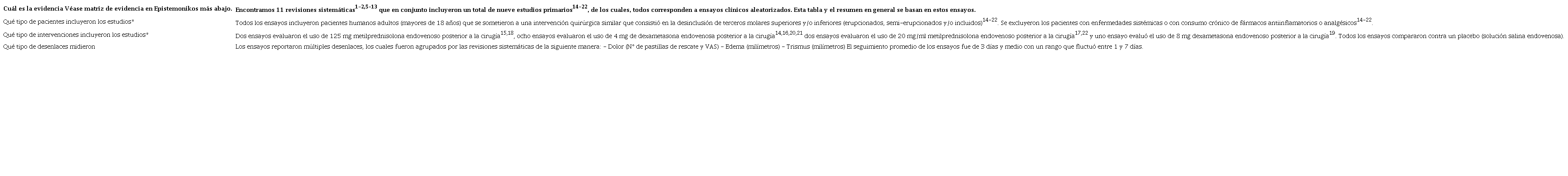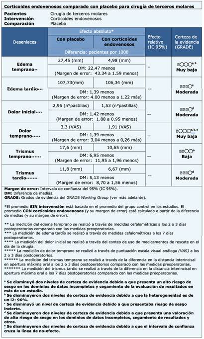 Resultados y conclusiones: Se identificaron 11 revisiones sistemáticas que en conjunto incluyeron un total de nueve estudios primarios, los cuales todos corresponden a ensayos clínicos aleatorizados. Se concluyó que no es posible establecer con claridad si los corticoides endovenosos disminuyen el edema y el dolor al segundo o tercer día postoperatorios, debido a que la certeza de la evidencia existente fue evaluada cómo muy baja. Por otro lado, podrían disminuir el trismus al segundo o tercer día postoperatorios con un nivel de certeza de la evidencia baja. Por último, probablemente resultan en poca o nula diferencia en el edema al séptimo día postoperatorio, disminuye levemente el dolor al primer día postoperatorio y probablemente disminuyen el trismus al séptimo día postoperatorio con un nivel de certeza de evidencia moderada.