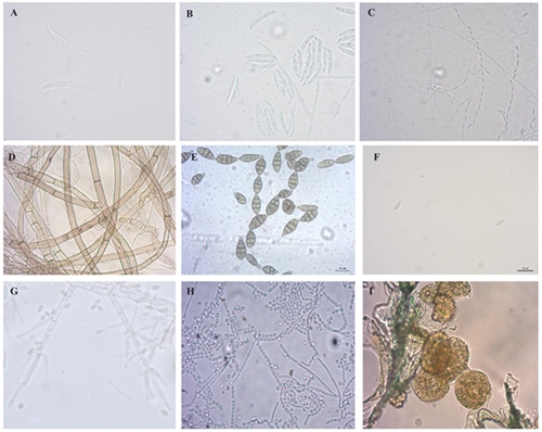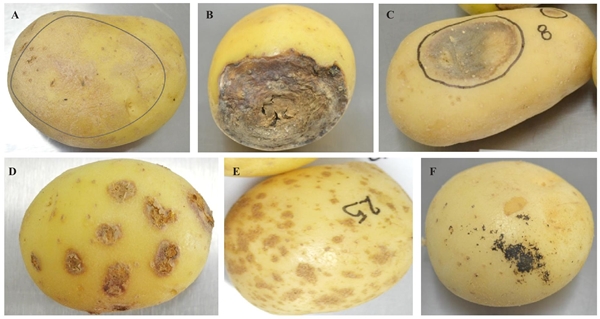 Del total de las muestras analizadas el 50% resultó positivo a bacterias, el 41% a hongos y del 9% no se identificó ningún organismo relacionado al daño. En lo que respecta a hongos, se identificó a: Fusarium sp. (F. oxysporum, F. solani, F. verticillioides), Rhizoctonia solani, Alternaria sp., Colletotrichum sp., Clonostachys sp., Geotrichum sp., y al protozoario Spongospora subterranea f sp. subterranea (Figura 1 y 2). Las especies del Alternaria, Colletotrichum, Clonostachys, Fusarium, Rhizoctonia, han sido asociadas anteriormente a colonizar la superficie de los tubérculos (Fiers et al., 210; Naerstad et al., 2012; Gherbawy y Gashgari, 2013; Zimudzi et al., 2017).