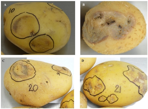 La papa (Solanum tuberosum L.) es uno de los cultivos más utilizados para el consumo humano a nivel mundial. De este tubérculo se producen 381 millones de toneladas anualmente en el mundo (FAO, 2014). En México ocupa el quinto lugar en importancia alimenticia, superado por el maíz, trigo, frijol y arroz. Del total de la producción nacional, el 56% se destina para consumo en fresco, 29% para la industria y el 15% como semilla (Mora-Aguilar, 2014). A nivel mundial, se han reportado alrededor de 70 enfermedades y desordenes fisiológicos que afectan a este cultivo y causan severos daños especialmente en los tubérculos (Herrera y Scott, 1993; Stevenson, 2001). Entre los síntomas de las enfermedades que afectan tubérculos se identifican agallas, manchas y pudriciones (Fiers et al., 2012), principalmente; estos pueden ser ocasionados por hongos, bacterias, nematodos y virus. Asimismo, existen otros factores que además de la apariencia física, demeritan la calidad de los tubérculos provocando el rechazo por el consumidor; sin embargo, Fiers et al., (2010) mencionó que las manchas superficiales afectan solamente la epidermis de los tubérculos, sin alterar su sabor y propiedades nutricionales (Jemison et al., 2008; Vázquez-Carrillo et al., 2013). Algunas de estas alteraciones superficiales que afectan la peridermis de los tubérculos son el resultado de la presencia de patógenos como Colletotrichum coccodes, Helminthosporium solani, Rhizoctonia solani, Spongospora f. sp subterranea y Streptomyces spp.; además, de ser en muchos casos vía de entrada para otros microorganismos oportunistas que conducen a la pudrición de tubérculos. Especies de hongos como Fusarium sp., con frecuencia causan daños relevantes a nivel mundial en tubérculos que se encuentran en campo y almacenamiento, en esta última puede llegar a afectar hasta el 60% de la producción (Boyd, 1972). También se pueden presentar otras condiciones que provocan la mala calidad y apariencia, estas pueden ser debidas a daños mecánicos, por insectos, factores abióticos como la humedad y temperatura, el uso de productos químicos, deficiencias nutrimentales, y otros daños que se desconocen sus causas, conocidos como manchas atípicas (Friedmans, 1960; Stevenson et al., 2001; Fiers, 2010; Naerstad et al., 2012). Por otra parte, las bacterias y hongos que ocasionan pudriciones o daños más severos en la peridermis de tubérculos, producen una amplia gama de enzimas como pectinasas, celulasas, xilanasas y proteasas, responsables de la maceración del tejido y muerte celular (Olivieri et al., 2004). Los síntomas incluyen ya sea pudriciones secas o blandas, decoloración del tubérculo y pudrición anular, y son debidas a diversos hongos como Fusarium spp., Verticillium spp.; bacterias, como Pectobacterium carotovorum subsp. carotovorum, Pectobacterium carotovorum subsp. atrosepticum, Ralstonia solanacearum, entre otras (de Haan et al., 2008; Czajkowski et al., 2011; Fiers et al., 2012; Gashgari y Gherbawy, 2013). Debido a lo anterior, el objetivo de este estudio fue identificar a los microorganismos asociados a síntomas y daños en postcosecha de tubérculos de papa destinados para consumo humano que se pueden encontrar en sitios comerciales, como la Central de Abastos de Ecatepec.