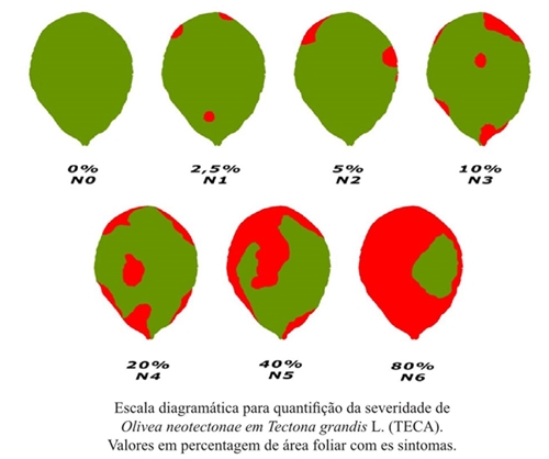 La escala diagramática propuesta es adecuada para la evaluación de la severidad de la roya en las hojas de teca, siendo capaz de proporcionar precisión y repetitividad das estimativas. Este procedimiento estándar puede ser de gran valor para la aplicación en las encuestas de campo, en los estudios epidemiológicos y en la evaluación de las medidas de control de la enfermedad.