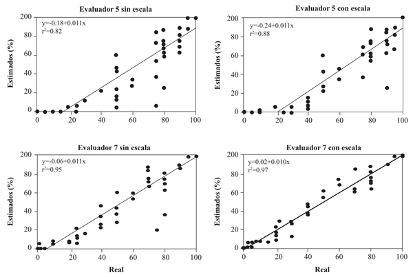 Con la adopción de la escala diagramática propuesta, todos los evaluadores mejoraron la precisión de las estimaciones (r²=0.93) en comparación con el resultado obtenido sin el uso de la escala (r²=0.88).
