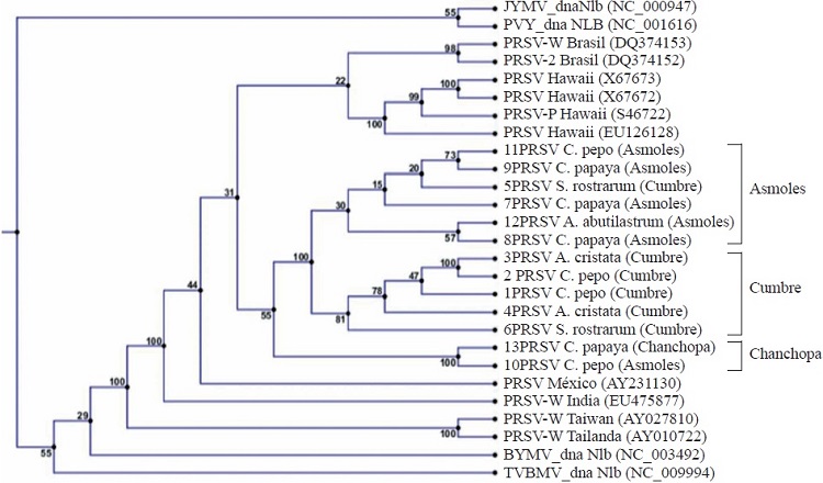 El análisis de BLASTn de 13 secuencias generadas en el presente trabajo correspondientes a la región NIb de PRSV permitió identificar por primera vez a A. abutilastrum, A. cristata y S. rostratum como nuevas especies hospedantes naturales de PRSV. Además, también se incluyeron secuencias aisladas de C. papaya y C. pepo, aunque estas ya están ampliamente reportadas como hospederas de PRSV (Noa-Carranza et al., 2006; Sreenivasulu y Sai-Gopal, 2010; Goyal et al., 2012; Mansilla et al., 2013). La filogenia (Figura 3) permitió identificar tres grupos de secuencias similares. Se observa una clara agrupación de acuerdo a la zona de plantación, en las que se observó la muestra 11 y 12 correspondiente a C. pepo y A. abutilastrum respectivamente fue la misma que la encontrada en C. papaya correspondiente a la secuencia 9 y 8 perteneciente a Los Asmoles. Este hallazgo confirma de manera clara que la maleza aporta el mismo virus a las plantas de papayo. Otra observación importante fue la diversidad en secuencias que se encontraron para la zona de Colima que diferencia claramente con otros aislados incluso con el reportado para Veracruz (AY231130) con un 92% de homología. Esta diversidad en aislados de PRSV se ha observado para regiones de China, debido a la alta tasa de mutación del virus (Zhao et al., 2016), lo que complica las estrategias de control para este virus. Como era de esperarse, otros Potyvirus como: Japanese yam mosaic potyvirus (JYMV), Potato virus Y (PVY), Bean yellow mosaic virus (BYMV), Tobacco vein banding mosaic virus (TVBMV) fueron los más alejados en el dendrograma con un porcentaje de identidad en la secuencia del 70 al 73%.