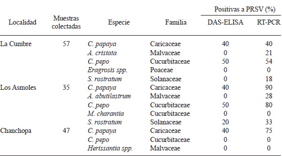 La detección de PRSV mediante DAS-ELISA y RT-PCR en plantas de C. papaya y maleza asociada al cultivo procedentes de tres localidades de Colima son mostrados en el Cuadro 1. De las 139 muestras colectadas se analizaron por DAS-ELISA 57 de ellas, provenientes de la localidad de La Cumbre, y resultaron positivas para PRSV C. papaya y C. pepo. Lo anterior puede atribuirse a que las muestras analizadas no alcanzaron la concentración mínima viral, ya que está reportado que la técnica de DAS-ELISA no detecta virus en plantas si su concentración es menor de 0.1 ng de virus por mL (Salazar, 1996). En el presente estudio se reportó hasta un 50% de muestras positivas por DAS-ELISA; porcentaje significativamente elevado a diferencia del obtenido por Hernández de la Cruz et al. (2007) quienes detectaron el 2.43% de PVYNTN en tubérculos de papa por DAS-ELISA.