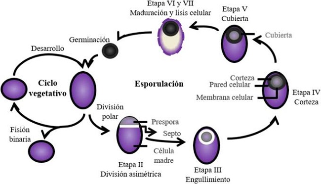 La presencia de endosporas le confiere al género de Bacillus su capacidad de diseminación y prevalencia en los ecosistemas, éstas se forman durante su segunda fase del ciclo de vida, el cual se encuentra conformado por una fase de crecimiento vegetativo y una fase de esporulación (Figura 2). Durante la primera etapa, la bacteria crece de forma exponencial mediante fisión binaria, ya que se encuentra en un medio con las condiciones favorables para su desarrollo. La segunda fase comienza como una estrategia de supervivencia en presencia de algún tipo de estrés (alta densidad de población, escasez de nutrientes, factores externos como salinidad, temperatura, pH, entre otros), así la célula vegetativa inicia la formación de la endospora, lo cual implica la división celular asimétrica, dando lugar a la formación de dos compartimentos, célula madre y la inmersión de una preespora. Posteriormente, la preespora es engullida, formando una célula dentro de la célula madre. Durante las etapas posteriores, la preespora es recubierta de capas protectoras (componentes proteicos, peptidoglicano y una pared que reside debajo de ésta, formada por células germinales), seguido de la deshidratación, y la maduración final de la preespora. Finalmente, la célula madre se lisa mediante muerte celular programada, liberando la endospora. La endospora puede permanecer viable en el ambiente hasta que las condiciones son favorables para iniciar sus procesos metabólicos y generar una célula vegetativa (Errigton 2003; Tejera-Hernández et al., 2011; CALS; 2016). Por lo anterior, la formación de endosporas resistentes al calor y desecación es una característica de importancia para la formulación de productos biotecnológicos a base de cepas de este género bacteriano (Pérez-García et al., 2011).