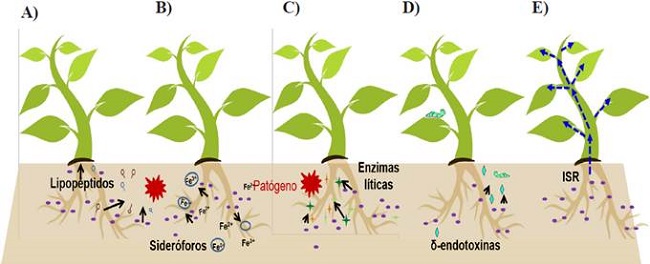 Una gran diversidad de especies del género Bacillus han demostrado tener actividad antagónica contra diversos microorganismos fitopatógenos de cultivos agrícolas, tales como maíz, arroz, frutales, entre otros (Wang et al., 2014; Li et al., 2015). El estudio de esta capacidad de Bacillus se inició por el descubrimiento de la actividad insecticida de las proteínas Cry producidas por B. thuringiensis; en la actualidad diversas especies del género Bacillus (B. subtilis, B. pumilus, B. amyloliquefaciens y B. licheniformis) son ampliamente estudiadas para mitigar la incidencia de enfermedades de importancia agrícola (Raaijmakers y Mazzola, 2012). Entre las principales vías por las cuales estas cepas evitan el establecimiento y desarrollo de organismos fitopatógenos es a través de diferentes mecanismos, que incluyen A) la excreción de antibióticos, B) sideróforos, C) enzimas líticas, D) toxinas y E) induciendo la resistencia sistémica de la planta (IRS) (Figura 3) (Layton et al., 2011; Tejera-Hernández et al., 2011).