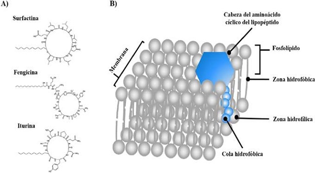 Una de las características más importantes del género Bacillus es su capacidad de producir una gran variedad de antibióticos con capacidad de inhibir el crecimiento de agentes fitopatógenos, entre éstos, los lipopéptidos cíclicos no ribosomales han sido los más estudiados. Los lipopéptidos (LPs), estructuralmente consisten en un péptido cíclico unido a una cadena de ácido graso β-hidroxi o β-amino (Figura 4-A), clasificándose en 3 diferentes familias (iturinas, fengicinas y surfactinas), de acuerdo con su secuencia de aminoácidos y longitud del ácido graso (Ongena y Jaques, 2008; Falardeau et al., 2013). Estas moléculasson sintetizadas por complejos multi-enzimáticos, conocidos como sintetasas de péptidos no ribosomales (NRPS del inglés, nonribosomal peptide synthetase), las cuales son independientes del RNA mensajero (Chowdhury et al., 2015). Las familias de las iturinas, fengicinas y surfactinas, han sido ampliamente estudiadas por su actividad antibacteriana y antífúngica (Meena y Kanwar, 2015). La actividad antimicrobiana de estos LPs tiene lugar por su interacción con la membrana citoplasmática de células bacterianas o fúngicas, provocando la formación de poros y un desbalance osmótico, lo que desencadena la muerte celular de los microorganismos fitopatógenos (Figura 4-B) (Aranda et al., 2005; Gong et al., 2006). Sin embargo, recientemente se ha reportado que algunos lipopéptidos pueden tener múltiples mecanismos de acción, al terando procesos celulares como homeostasis intracelular de calcio, metabolismo energético y procesamiento del RNA (Zhang et al., 2016).El papel de los LPs se ha evidenciado en la inhibición del crecimiento de microorganismos fitopatógenos. Touré et al. (2004) identificaron múltiples isoformas de lipopéptidos en extractos generados a partir de cultivos líquidos de B. subtilis GA1. Posteriormente, en un ensayo de coinoculación de la cepa GA1 y Botrytis cinerea en frutos de manzano, identificaron la presencia de fengicinas e iturinas en concentraciones inhibitorias, demostrando la actividad de estos lipopéptidos in-situ. Además, análisis de expresión génica y mutagénesis dirigida han contribuido de manera significativa a comprender el papel de los lipopéptidos en la actividad antimicrobiana del género Bacillus contra microorganismos fitopatógenos (Xu et al., 2013). Por ejemplo, Li et al. (2014) mutaron el gen de la fosfopanteteína transferasa (sfp) en la cepa SQR9 de B. amyloliquefaciens, indispensable en el funcionamiento de sintetasas de péptidos no ribosomales (NRPS), y por tanto de la síntesis de lipopéptidos. Dicha mutación resultó en un fenotipo carente de actividad antifúngica contra diversos fitopatógenos de importancia agrícola, incluyendo Verticillium dahliae, Sclerotinia sclerotiorum, Fusarium oxysporum, Rhizoctonia solani, Fusarium solani, Phytophthora parasítica.