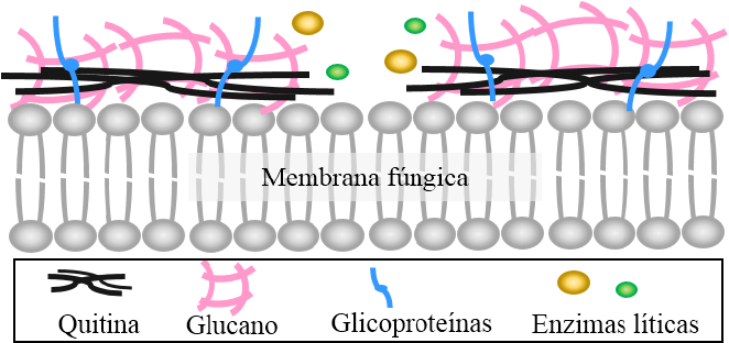 La producción de enzimas involucradas en la degradación de la pared celular de agentes fitopatógenos es uno de los mecanismos de control biológico más reportados, especialmente contra patógenos de origen fúngico. La pared celular de hongos está conformada por glicoproteínas, polisacáridos y otros componentes que varían según la especie fúngica (Bowman y Free, 2006). La fracción de polisacáridos puede comprender hasta un 80% de la pared celular de hongos, encontrándose principalmente quitina (~ 10 - 20%) y glucano (~ 50 - 60%), los cuales están compuestos por residuos de beta-1,3-glucosa y beta-1,4-N-acetilglucosamina, respectivamente (Bowman y Free, 2006; Latgé, 2007). Estos polímeros tienen un papel estructural determinante en la rigidez de la pared celular, mediante una red extensa de enlaces glucosídicos. Así, la interferencia en estos enlaces puede deteriorar la pared celular de hongos fitopatógenos, provocando su lisis y muerte celular.