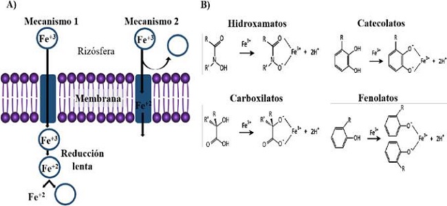 El hierro (Fe) es un nutriente esencial para importantes funciones celulares, tales como en las reacciones redox de las proteínas con cofactores (Fe-S), en la cadena de transporte de electrones, y catalizando reacciones enzimáticas vitales, como aquellas en las que se encuentra involucrado el hidrógeno, oxígeno y nitrógeno (Faraldo-Gómez y Sansom, 2003). El Fe es encontrado en la naturaleza mayormente en forma férrica (Fe3+) de baja solubilidad, imposibilitando su uso por algunos seres vivos (Aguado-Santacruz et al., 2012). En respuesta a la restricción de hierro en el ambiente algunos microorganismos han desarrollado diversas estructuras proteicas receptoras, de bajo peso molecular y con alta afinidad por el hierro, llamadas sideróforos, facilitando la captación de Fe+3 (Thyagarajan et al., 2017). Los sideróforos son metabolitos secundarios que actúan como secuestrantes o quelantes de hierro, consecuencia de su elevada constante de disociación por este metal, oscilando entre 1022 y 1055. Lo cual permite la formación de complejos Fe3+- sideróforo, así los microorganismos productores de sideróforos, mediante un receptor específico localizado en la membrana, pueden utilizarlo por dos mecanismos: 1) directamente mediante el complejo Fe3+- sideróforo a través de la membrana celular, o 2) reducido extracelularmente a complejos Fe2+ (Neilands, 1995) (Figura 6-A). Los sideróforos en función de su principal grupo quelante se clasifican en: hidroxamatos (utilizando ácidos hidroxámicos), catecolatos (conteniendo anillos catecol), carboxilatos, fenolatos, y en combinación de dos o más de estos grupos (Wilson et al., 2016) (Figura 6-B). Una amplia diversidad de cepas con capacidad de control biológico pertenecientes al género Bacillus han mostrado la capacidad de sintetizar sideróforos, regulando la concentración de hierro en el medio a través de su quelación (Fe3+-sideróforo), ocasionando que este metal no se encuentre disponible para microorganismos patógenos, cuyo crecimiento es altamente dependiente de este elemento (Scharf et al., 2014). Por otra parte, la formación de dichos complejos no afecta el desarrollo de las plantas, la mayoría de ellas pueden crecer en concentraciones de hierro inferiores que aquellas requeridas por estos agentes de control biológico, así mismo algunas plantas presentan la capacidad de aprovechar estos complejos microbianos, incrementando su biodisponibilidad a este elemento (Aguado-Santacruz et al., 2012).