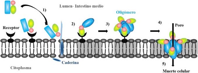 Las proteínas Cry se encuentran ampliamente utilizadas por su eficacia en el control biológico de insectos, cuyo mecanismo de acción inicia una vez que las proteínas Cry son procesadas proteolíticamente a través de proteasas presentes en el intestino medio del huésped, separando una sección de aminoácidos en la región N-terminal y en el extremo C-terminal (dependiendo de la naturaleza de la proteína Cry), liberando así fragmentos activos y tóxicos que interactúan con las proteínas receptoras presentes en células intestinales (Figura 7). Estos fragmentos son reconocidos por receptores específicos en la membrana e insertados a través de la caderina (1), dando sucesión a una serie de señales para la formación de una estructura oligomérica preporo (2-3) y consecuentemente el poro lítico (4), por el cual se efectúa un desequilibrio osmótico, que finalmente destruye el epitelio intestinal y en consiguiente la muerte celular (5) (Portela-Dussán et al., 2013; Xu et al., 2014).