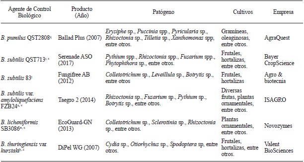 Dentro de los bioplaguicidas microbianos disponibles comercialmente, Bacillus es el género más explotado en la biotecnología agrícola, con un 85% de los productos bacterianos, debido a su gran versatilidad metabólica que le permiten llevar a cabo el control biológico de plagas y enfermedades por diversos mecanismos. Además, este género bacteriano es capaz de producir endosporas, siendo éstas el principal ingrediente activo de los formulados, y confiriéndoles -como propiedad- una mayor viabilidad en el tiempo (Ongena y Jaques, 2008).