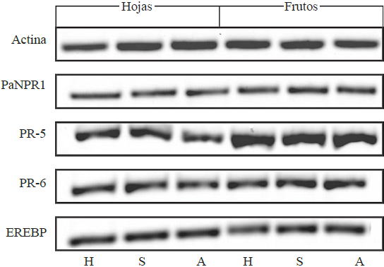 La expresión de genes NPR1 pueden inducir la expresión de PR-5 (Shah et al., 2001). Sin embargo, los resultados siguieren que los cambios de expresión de PR-5 en tejidos infectados por ASBVd no fueron inducidos por PaNPR1, debido a que los niveles de expresión de éste no muestran diferencias significativas con respecto a la expresión basal. Backer et al. (2015) reportaron que la expresión constitutiva basal de PaNPR1 fue más alta en hojas que en frutos inmaduros; además, y a diferencia del conocimiento que se tiene donde el ácido salicílico es activador de NPR1, los autores encontraron una regulación negativa de PaNPR1 en el tratamiento con ácido salicílico a las 12h después de la aplicación, lo que sugiere una función alternativa en las respuestas de defensa.