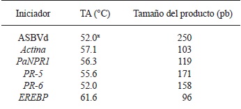 Se eligieron cuatro genes relacionados con defensa a patógenos en aguacate: PaNPR1 (Backer et al., 2015), PR-5, PR-6 y EREBP (Djami-Tchatchou et al., 2013). El gen de actina (Reeksting et al., 2014) se usó como gen de referencia. Las secuencias de los iniciadores se tomaron de las referencias mencionadas. Para la detección del ASBVd se emplearon los iniciadores diseñados por Schnell et al. (1997).