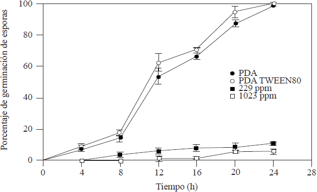 Germinación de esporas. Se evaluó el efecto de la CI50 y CMI del aceite esencial obtenidas por análisis Probit contra las esporas de A. tenuissima. Para ello, se distribuyeron 25 μL de la suspensión de esporas (105 esporas) sobre la superficie del medio de cultivo en la caja de Petri en testigos y tratamientos con aceite esencial. Las cajas de Petri se incubaron a 25 °C con fotoperiodo de 12 h luz-oscuridad hasta un tiempo máximo de 24 h. Se tomaron muestras aleatorias cada 4 h y se contó el número de esporas germinadas y no germinadas de un total de 200 esporas bajo un microscopio óptico. Se consideró como una espora germinada cuando la longitud del tubo germinativo fue de al menos el 50% de la longitud de la espora sin germinar (Dantigny et al., 2006).