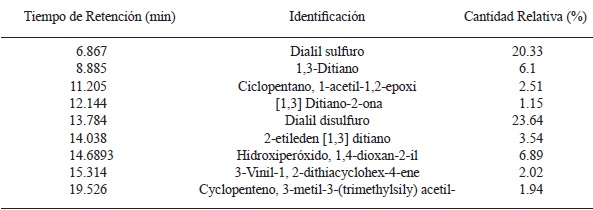 En el Cuadro 1 se muestran los principales componentes volátiles tentativos del extracto de ajo obtenidos por CG-MS con proporciones relativas ≥1%. Predominan compuestos con azufre en su estructura, entre los que destacan el dialil sulfuro y dialil disulfuro, los cuales son derivados de la actividad de la enzima alinasa al ser liberada por rompimiento del tejido durante la extracción de aceite (Kocić-Tanackov et al., 2012).