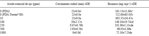 Diseño experimental y análisis estadístico. En el experimento se utilizó un diseño completamente al azar donde los tratamientos fueron: PDA, PDA-Tween® 80 (testigos) y concentraciones de aceite esencial de ajo en PDA-Tween® 80 (10, 100, 250, 500 y 1,000 ppm). Los siete tratamientos se evaluaron contra A. tenuissima donde la unidad experimental fue una caja de Petri. Las variables respuesta fueron crecimiento radial y producción de biomasa. Las CI50 y CMI se evaluaron en la etapa de germinación de esporas. Todos los experimentos se realizaron por triplicado. Los datos fueron analizados utilizando el programa estadístico JMP versión 5.0 (SAS, 2002) para el análisis de varianza (ANVA) y las medias de los tratamientos se separaron por la prueba de Tukey (p≤0.05).