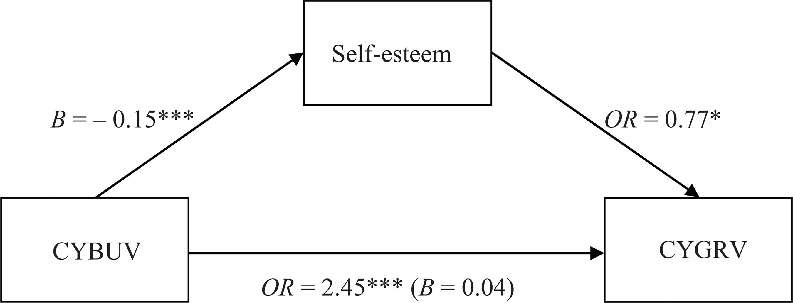 To whether the association between cyberbullying victimization and cybergrooming victimization was mediated by self-esteem, a mediation model was tested. Results revealed both significant direct effects of cyberbullying victimization on self-esteem (B =-0.149, p <.001, 95% CI [-0.19, -0.11]) and on the likelihood of experiencing cybergrooming victimization in the past (OR =2.45, 95% CI [p <.001, 95% CI [2.02, 2.96]). Additionally, higher self-esteem decreased likelihood of ever being cybergroomed (OR =0.77, 95% CI [p =.021, 95% CI [0.61, 0.96]). The indirect effect of cyberbullying victimization on cybergrooming victimization through self-esteem was small, but statistically significant (B = 0.04, 95% bootstrapped CI [0.01, 0.09]). In the mediation analysis, we controlled for age, sex, and dichotomized nationality (Western vs. Southeast Asian country, Figure 1).