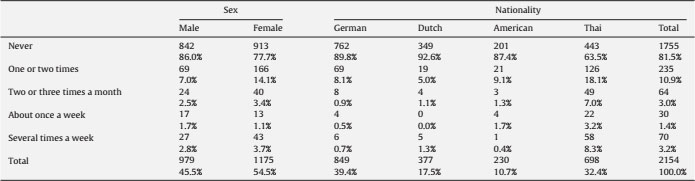 Concerning our first research question, the data showed that overall 18.5% (n = 399) of participants reported that they had at least once contact with a person who tried to sexually solicit them online. Regarding the contact frequencies, 81.5% (n = 1,755) reported they had never had contact with a cybergroomer, 10.9% (n = 235) reported contact one or two times, 3.0% (n = 64) two or three times a month, 1.4% (n = 30) once a week, and 3.2% (n = 70) several times a week. Table 1 illustrates the frequency rates of cybergrooming victims in total, by sex and nationality.