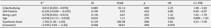 Regarding our third research question, we analyzed whether cyberbullying victimization and low self-esteem increased the probability of reporting cybergrooming victimization. For this analysis, we estimated a logistic regression model including cyberbullying victimization and low self-esteem as predictors. Cybergrooming was dichotomized as a criterion variable. In the regression analysis we controlled for sex, age, and nationality. As Table 2 illustrates, there were statistically significant influences on whether participants were cybergroomed. The model was significant, Log likelihood (null) =2059.30; LR (full)=1715.41; LR χ2 =15.37, df =8, p <.05, Nagelkerke’s R2 =.231. Cyberbullying victimization and cybergrooming victimization were significantly associated (B =0.812, p =.0001). Also self-esteem and cybergrooming victimization had a statistically significant relationship (B =- 0.226, p =.02). Specifically, each increase of one point on the five point scale of cyberbullying victimization was associated with increasing the odds of cybergrooming victimization by 2.2 times (OR = 2.25, 95% CI % [1.9, 2.6]) and each increase of one point on the four point self-esteem scale was associated with decreasing the odds ratios by 0.80 times (OR = 0.80 CI 95% [0.65, 0.97]). In addition, girls (B =0.278, p =.03) and Southeast Asian participants (b =1.76, p =.0001) were significantly more likely to suffer cybergrooming victimization.