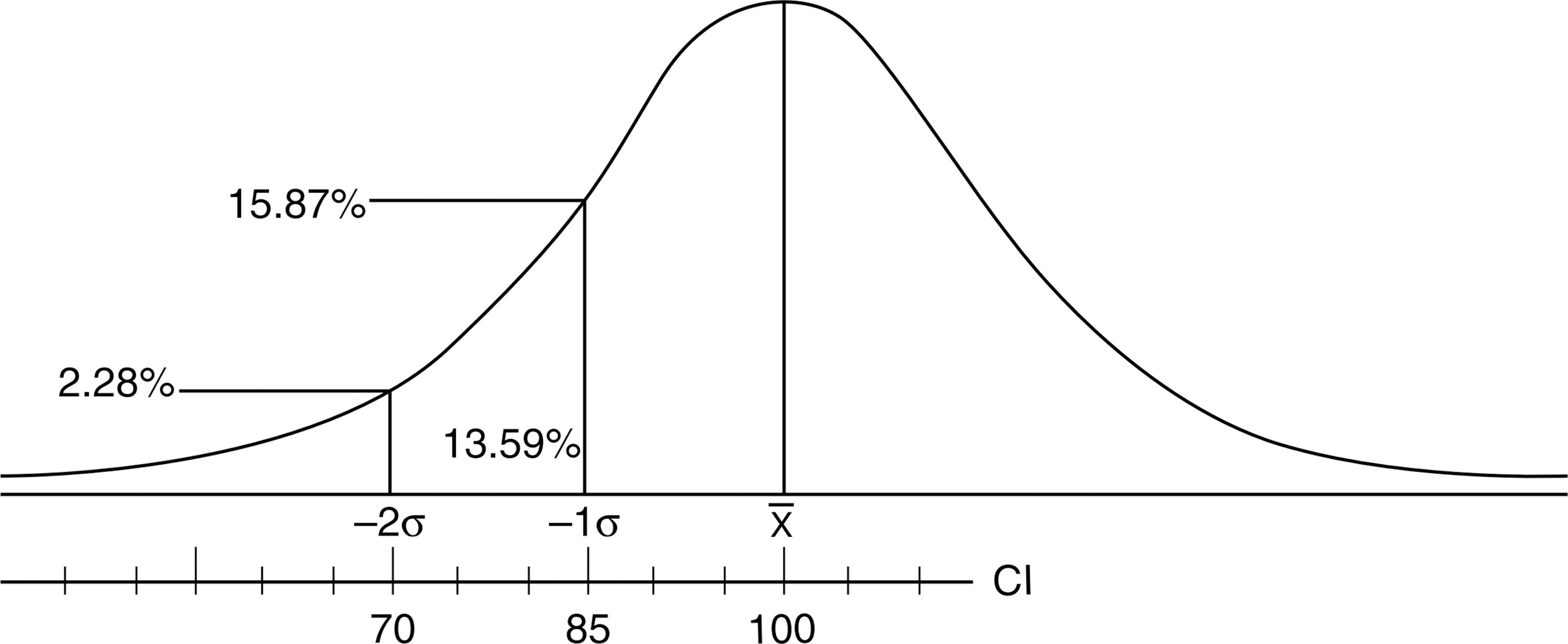 The problem is the concept of ‘significantly below average intellectual capacity’. Normally we refer to scores with a normal distribution, as shown in Figure 1 depicting the values 1SD and 2SD below the mean as significant deviations. Given the traditional IQ score (x = 100 and σ = 15), possible criteria would be scores of 70 (x - 2σ) or 85 (x - 1σ). There has been considerable controversy over what the cut off point for ‘average’ IQ should be (Grossman, 1973, 1983; Landesman & Ramey, 1989). The cut off points in the scale score are important as they determine the need for mobilisation of social resources for intervention and care; in some cases, there is a conflict of interest between the needs for intervention and the amount of resources offered by the community (Greve & Bianchini, 2004). Many development scales and other tests have been adopted as measurement scales as well as the cut-off point criteria without performing validation studies.