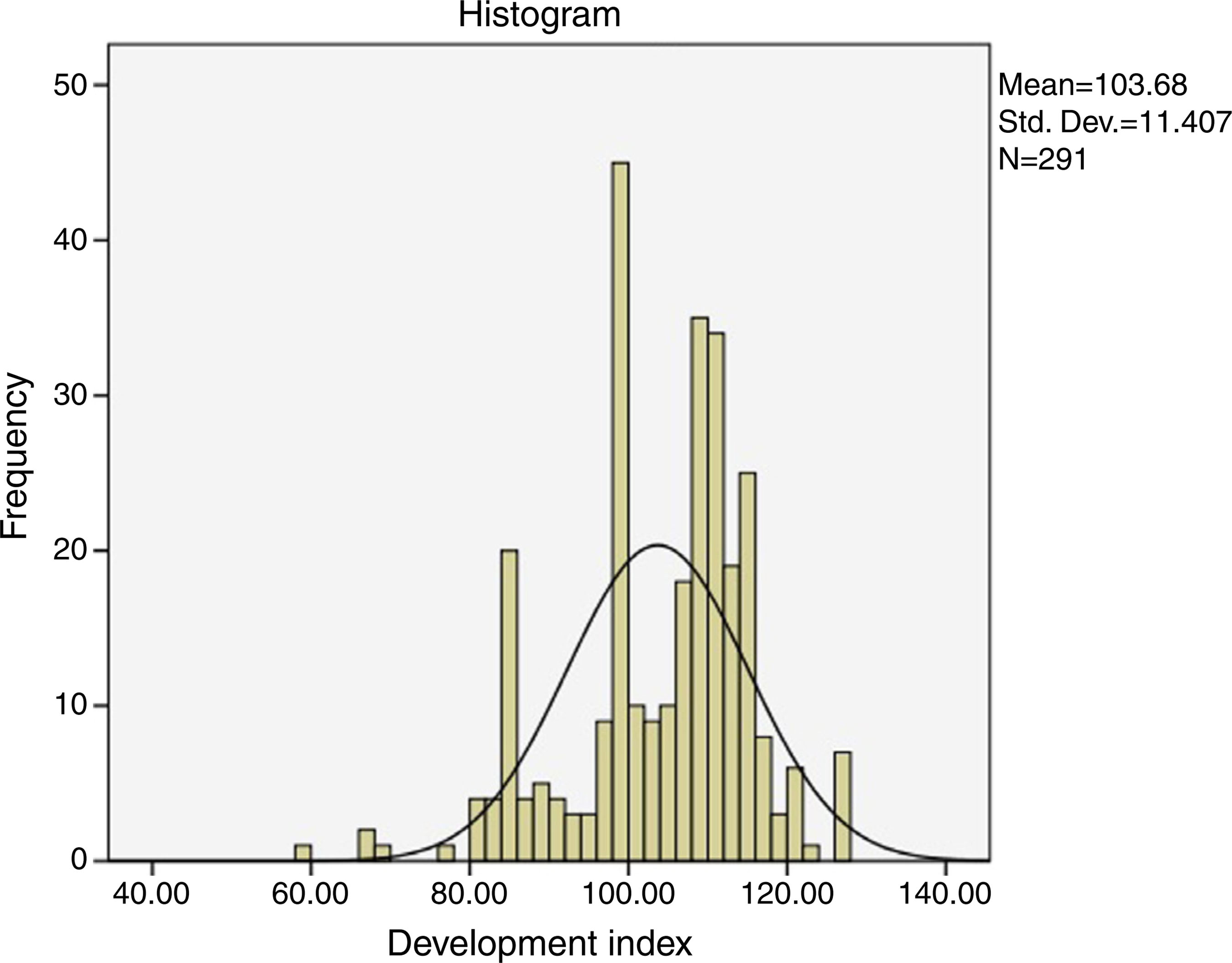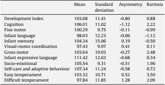 The mean and standard deviation of the standard score are 100 and 15 as IQ scores (Roid & Sampers, 2004). Table 4 shows the values of different subscales MP-R tend to take these values. We are confident that increasing the sample size these values converge. In any case, for the purposes of our study we want to score overall development (development index) whose distribution is shown in Figure 2.