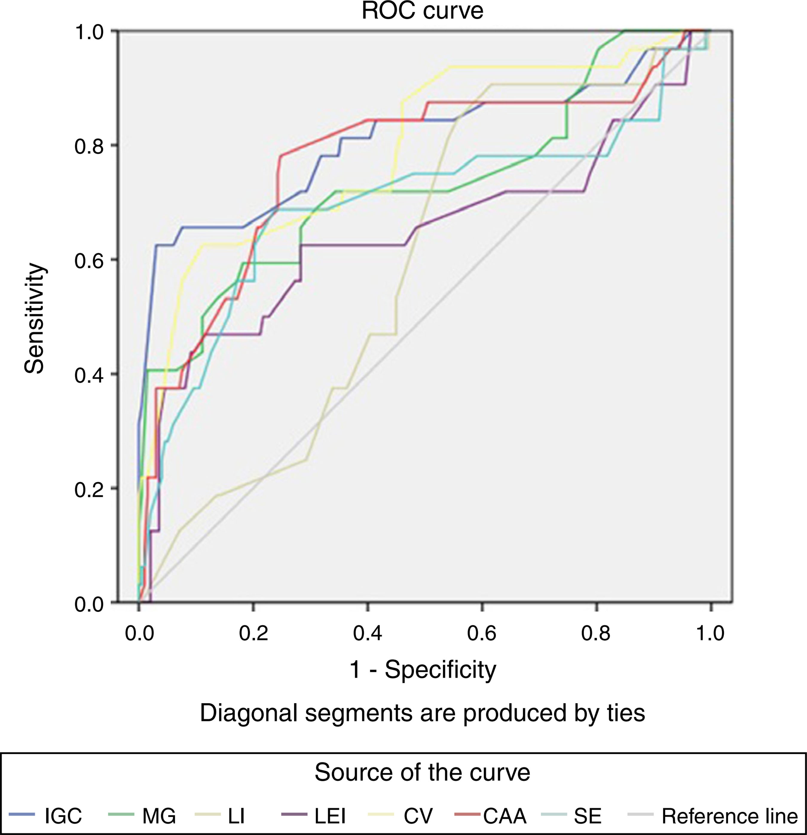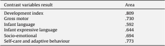 Figure 3 shows the graphs of the five subtests of the MP-R. The best representation will be the one closest to the upper left corner. When the curve loses its shape and is represented as a horizontal line, there are multiple values in the continuous variable to obtain the same diagnosis status. The goodness of fit is determined by the area under the curve (AUC). A value AUC = 1 represents a perfect test; an AUC = .5 represents a test that discriminates no better than chance. Table 5 shows AUCs for the curves shown in Figure 3. The largest AUC (.809) was for the Development Index (DI; a linear combination of the results of cognitive tests, language and motor skills), followed by Visual-Motor Coordination and Gross Motor. We opted to only use the DI because the possible developmental disorder detected after one year is not specific.