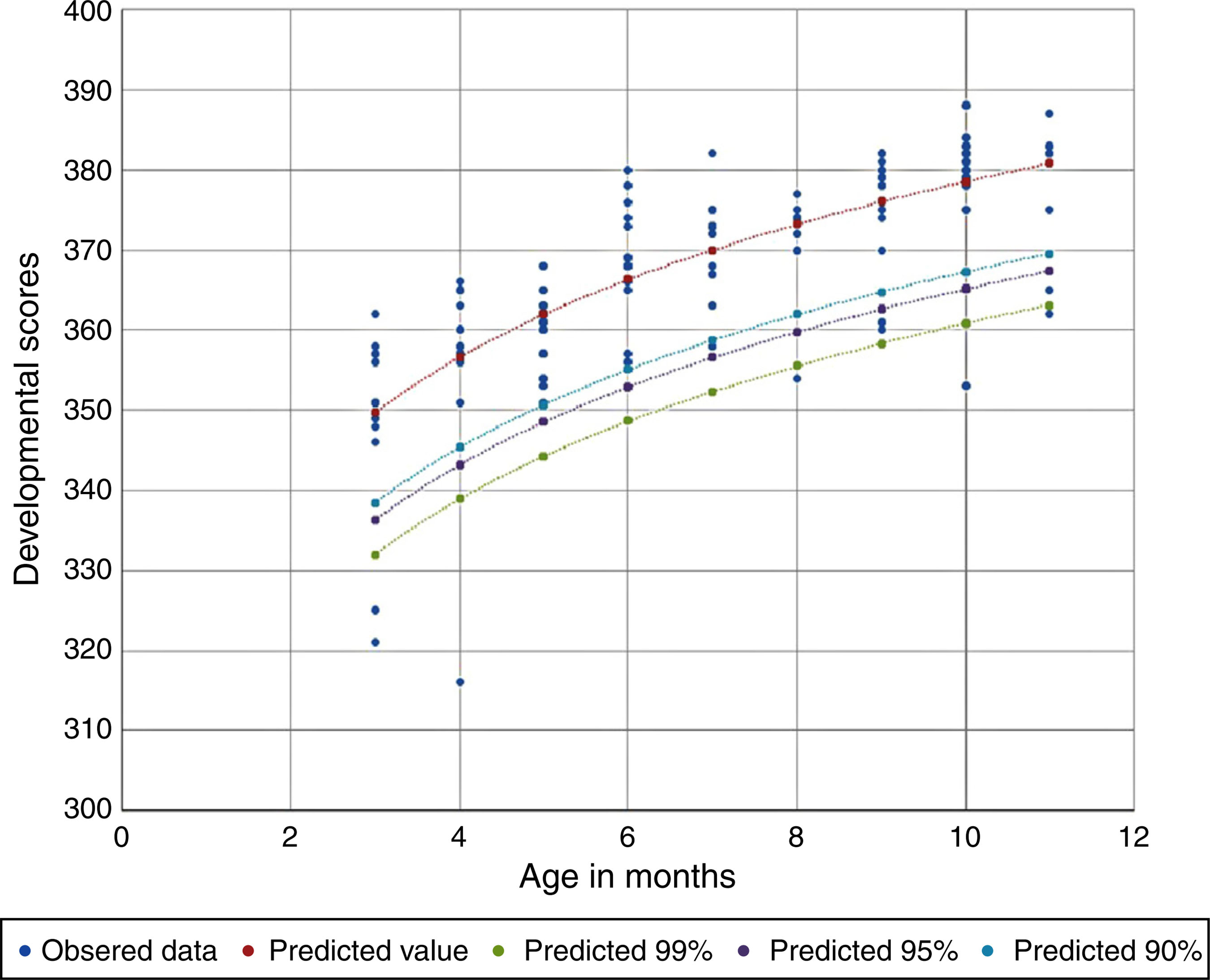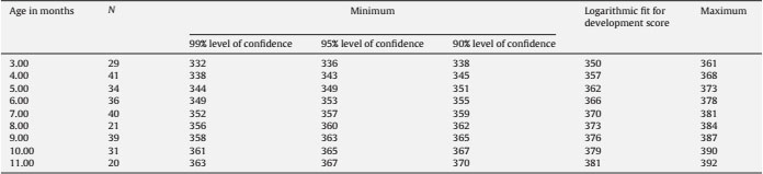 Since our study did not have adequate sample size, we decided to adjust the scores of development using the logistic regression equation. Figure 4 shows the distribution of development scores in terms of age for the first year of life. Table 7 summarizes the results of the logistic model. Note how the goodness of fit as measured by R2 (.66) was acceptable. The regression equation also determined the maximum and minimum predicted values for different confidence values. In this way, we could establish a range of values for each month in which scores of children believed to have normative development and those outside the range suspected of suffering some type of developmental disorder would be identified. This created a dynamic cut-off point, i.e., different for each month. The cut-off point was determined with the lower end of the range calculated for a given level of confidence. Tables 8 and 9 shows the results calculated at three levels (90%, 95% and 99% confidence) for each month (3-11 months).