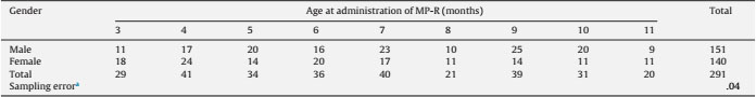 During the last quarter of 2011 and the first half of 2012 to validate the SDPTD “Early Detection System of Developmental Disability” during the first year of life (Alonso, 2014), we administered the MP-R scale to the sample described in Table 1.