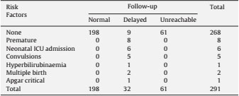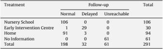 The predictive or prognostic validity of a test refers to its ability to predict a particular outcome. One year after administering the MP-R, we contacted the families who had participated by telephone to gather further data on their children's development. Table 2 presents these one-year follow-up data for type of treatment received and risk factors revealed during the parental interview. The attrition rate at this point was 20.96% despite repeated attempts to contact the families several times and via different means (phone, e-mail, and conventional mail).