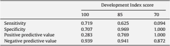 The selection of the cut-off depends on the social value of prediction error. Administration of a scale of development during the first year of life should be seen as a developmental screening and not as a formal diagnostic test. We believe it is more important that the negative predictive value (NPV) is small, i.e., subjects without pathology defined not really whether or not they develop in the future. From this perspective, it is noteworthy that in all cutoff used the NPV for Development Index score of the MP-R was very high (over .85). These results indicate that there is only a small risk that children with a score above the cut-off may have developmental problems.