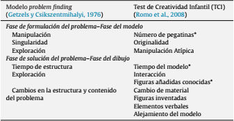 El análisis de los resultados de esta aplicación preliminar del TCI permitió la selección de las variables más significativas y relevantes en la evaluación de la creatividad infantil. De las diez variables incluidas inicialmente en este estudio, la versión final del TCI incluye solo siete. La versión final del test incorpora aquellas variables que mostraron vínculos significativos con la medida externa de creatividad valorada mediante el criterio de jueces. Las tres variables eliminadas fueron: tiempo del modelo (tiempo que el niño empleaba en realizar su modelo inicial), número de pegatinas (utilizadas en la realización del modelo) y figuras añadidas conocidas (número de figuras que aparecen en la hoja de dibujo que no estaban en el modelo pero sí en la lámina de pegatinas). Estas variables, incluidas por su relevancia en el estudio de referencia, fueron eliminadas por su escaso o nulo poder predictivo. En la tabla 1 se muestra la correspondencia entre las variables contempladas en el modelo de problem finding de Getzels y Csikszentmihalyi (1976) y las variables evaluadas por el TCI.