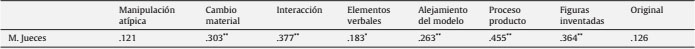 Los estudios en torno a la validez del instrumento se fundamentan en la Técnica de Evaluación Consensuada (Amabile, 1983, 1996). El uso de este procedimiento supone contar con un criterio externo fidedigno y representativo de la creatividad infantil: la propia evaluación independiente de jueces expertos en dibujo infantil. Los jueces fueron profesores del área de Expresión Plástica de las facultades de Educación de la Universitat de València y de la Universidad Autónoma de Madrid. Estos jueces, de forma independiente, valoraron los dibujos realizados por una submuestra de 250 niños al cumplimentar el TCI y ofrecieron una puntuación en creatividad. El nivel de acuerdo interjueces, evaluado mediante el alfa de Cronbach, fue de .80. La media de las valoraciones de los tres jueces para cada uno de los dibujos realizados por los niños fue utilizada como criterio externo de creatividad. En general, si bien los instrumentos de creatividad suelen encontrar problemas a la hora de reflejar el criterio de jueces independientes, todos los factores del TCI correlacionan positivamente con dicho criterio, destacando por encima de todos el total de variables proceso/producto (y entre ellas Interacción, Cambio de Material y Alejamiento del Modelo) y la variable Figuras Añadidas Inventadas (ver tabla 2).