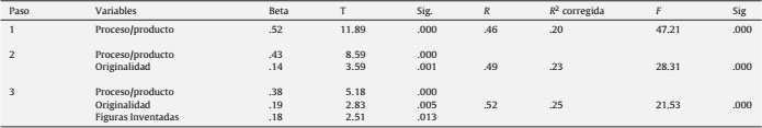 Para comprobar el poder predictivo de las variables del TCI respecto al criterio externo ofrecido por los jueces se recurrió al análisis de regresión múltiple (método de pasos sucesivos). Como podemos ver en la tabla 3, el modelo resultante incluye todas las variables definitivas del TCI a la hora de explicar las variaciones en la creatividad de los niños evaluada mediante jueces. Concretamente, dicho modelo contiene tres variables en el siguiente orden: variables proceso/producto, Originalidad y Figuras Añadidas Inventadas.