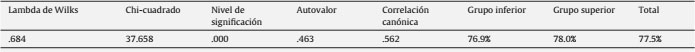 Como análisis complementario a los modelos de regresión se realizó un análisis discriminante. Concretamente seguimos explorando la capacidad predictiva del TCI al comprobar en qué medida es capaz de clasificar correctamente la asignación de los jueces a los grupos de alta y baja puntuación en creatividad. Como podemos observar en la tabla 4, la prueba chi cuadrado avala la capacidad discriminativa. A partir del valor en la correlación canónica podemos observar que el 56.2% de la varianza en las valoraciones de los jueces es explicada por las puntuaciones en el TCI. Más concretamente, un 76.9% de los casos resultan correctamente asignados al grupo de puntuaciones bajas mientras que un 78% al grupo de puntuaciones altas. Globalmente, un 77.5% de los casos son apropiadamente incorporados a sus grupos.
